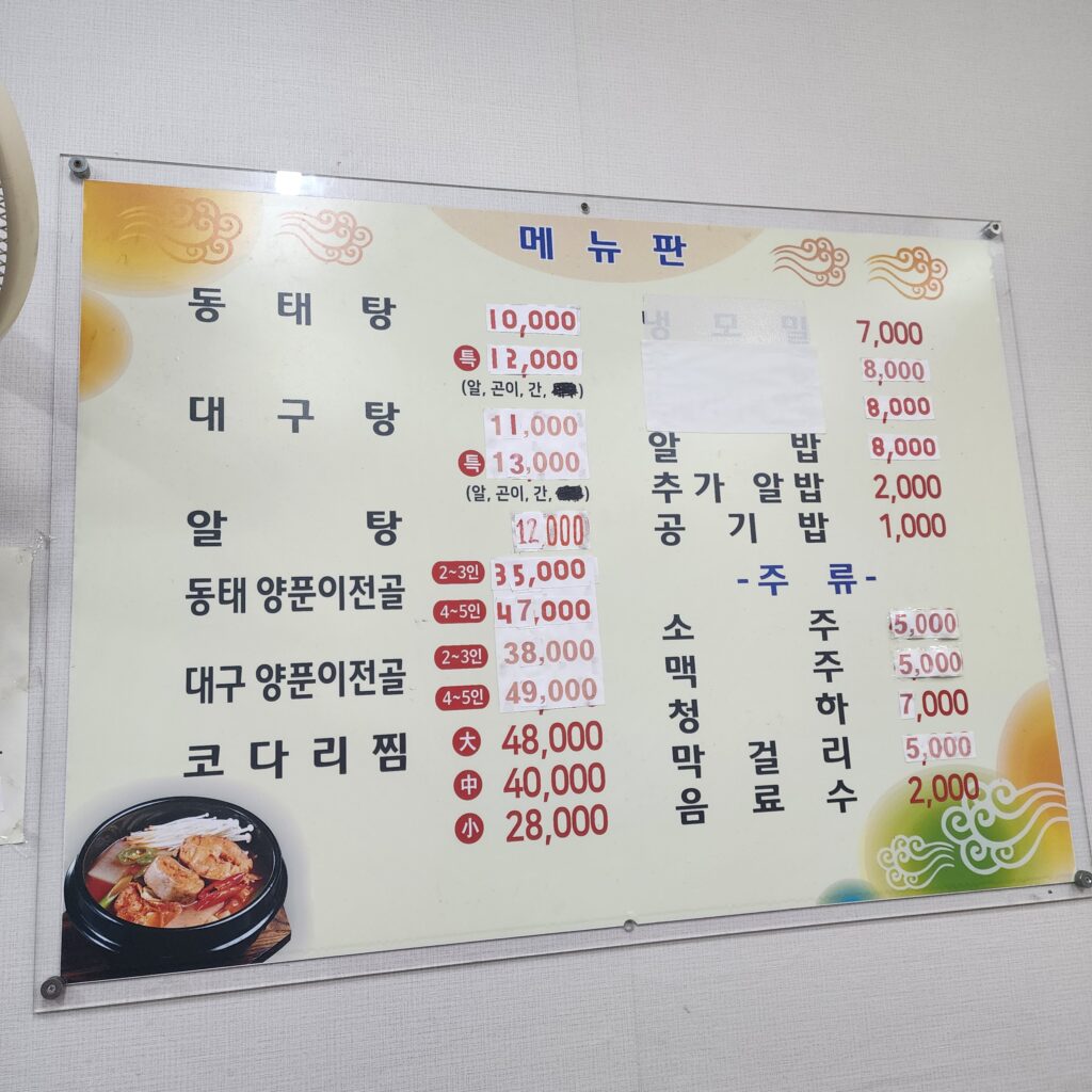 우연히 들어간 집이 이렇게 맛있을 줄이야! 터미널 바로 건너편에서 발견한 ‘문길수 동태탕’. 나중에 알고 보니 사장님 성함을 건 식당이었습니다.