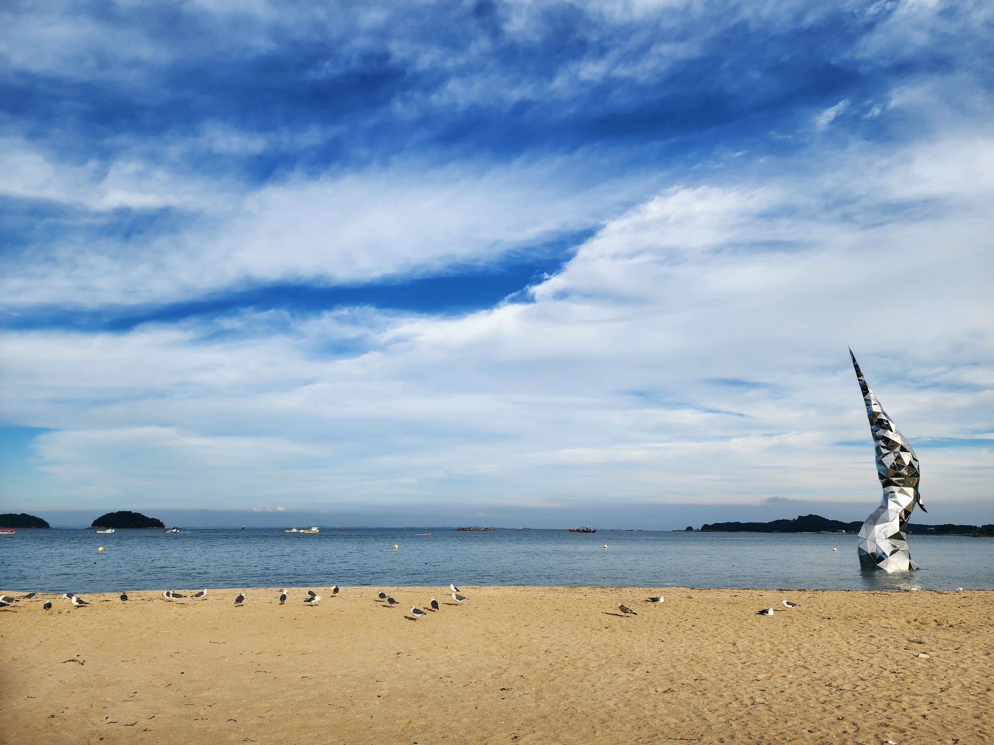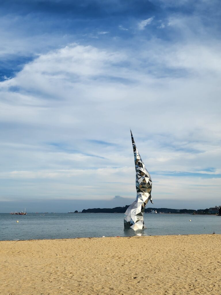 하트 사이로 보이는 조형물은 왜가리를 형상화한 ‘새빛왜목’입니다.