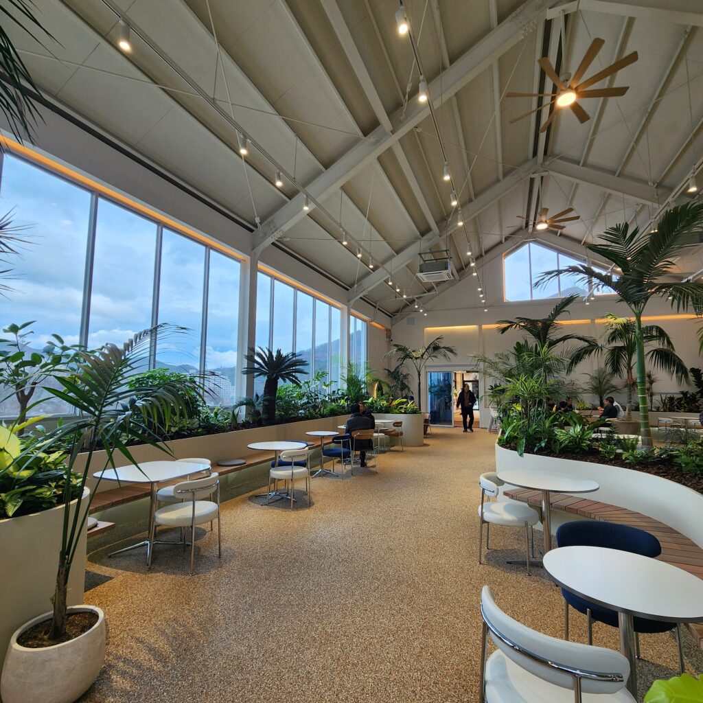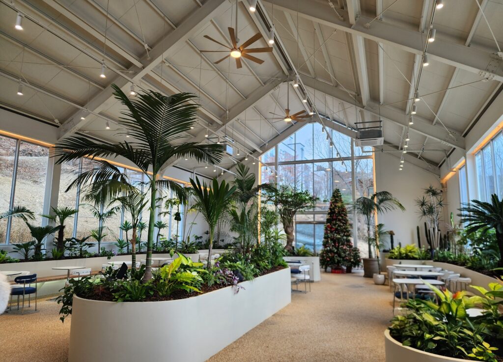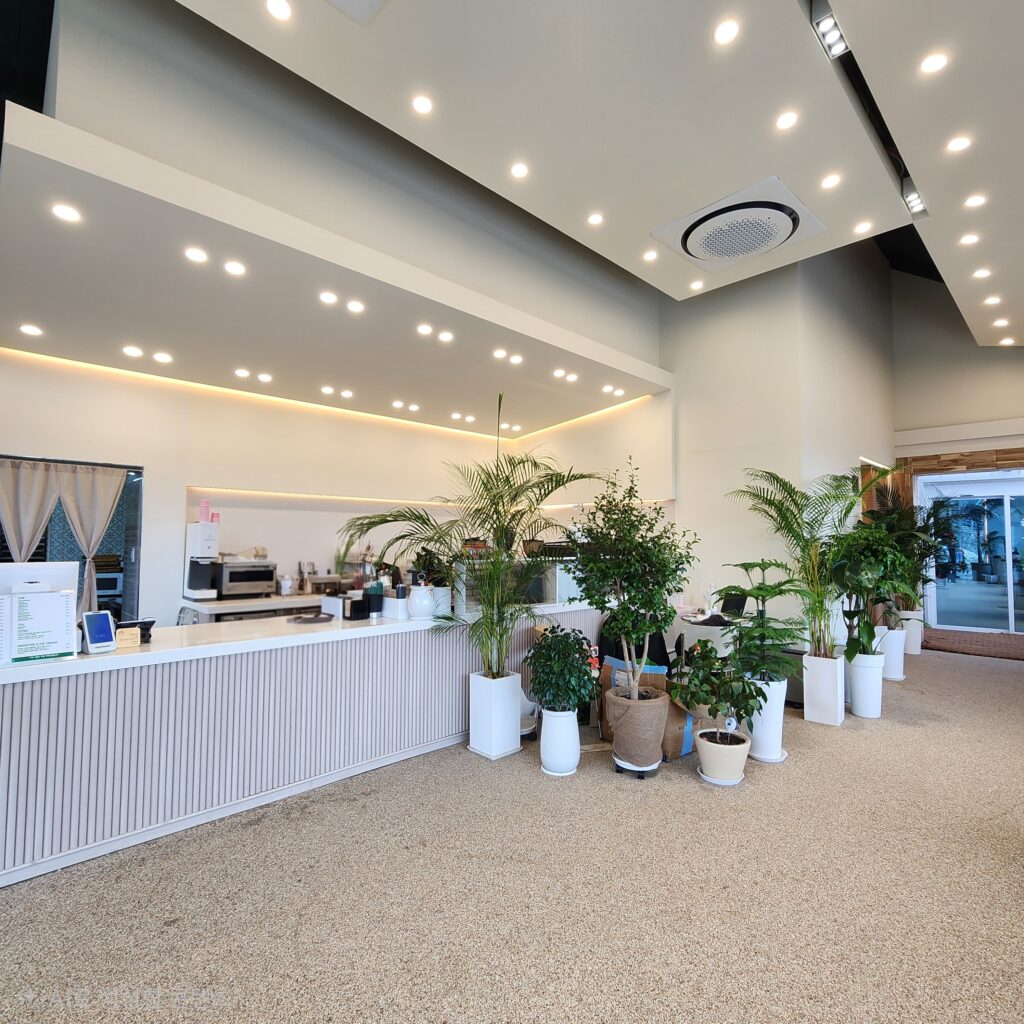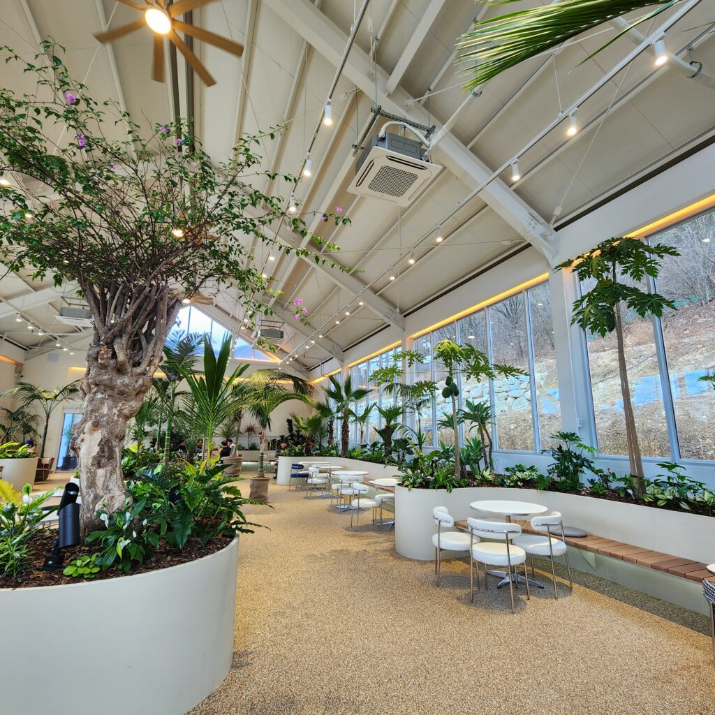 천장이 높고 자연광이 풍부하게 들어와, 카페라기보다 작은 식물원에 머무는 듯한 인상을 줍니다. 식물 관리 상태가 뛰어나 공간 전반이 정돈된 느낌을 줍니다.