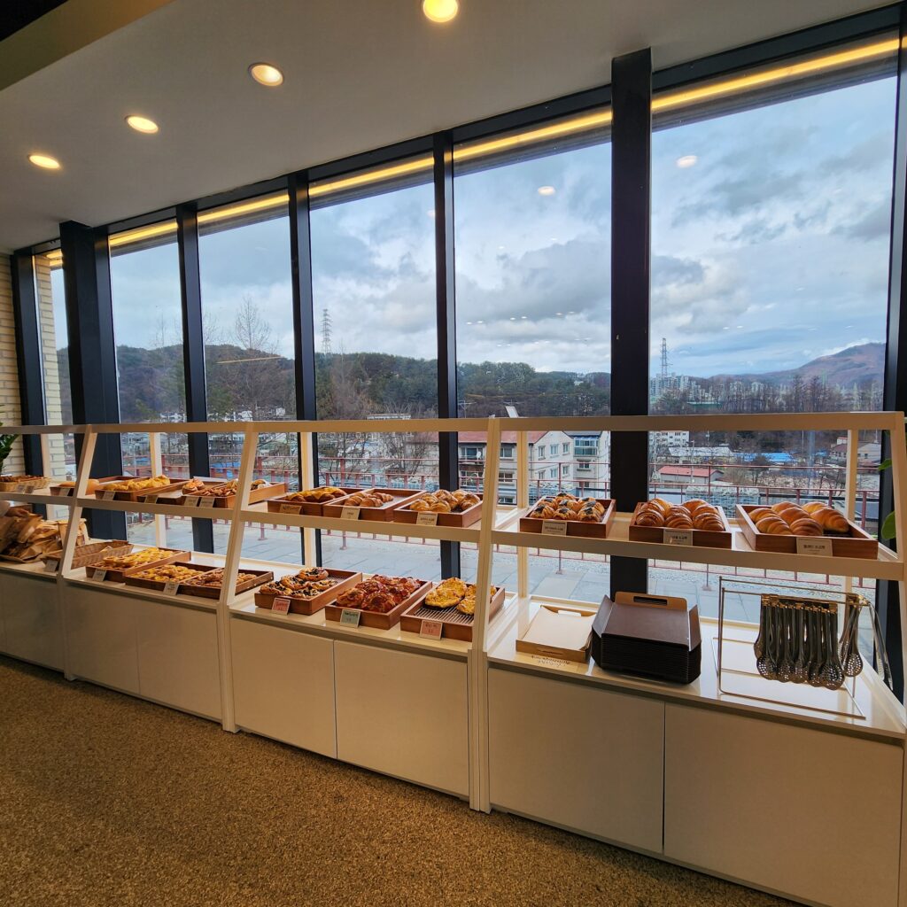 2층 카페에서는 넓은 창을 통해 주변 자연을 감상하며 차와 빵을 먹을 수 있습니다.